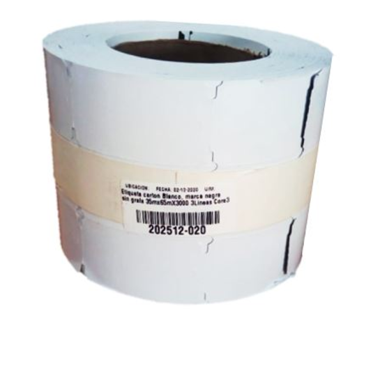 Etiqueta carton Blanco, marca negra sin grafa 35mx65mX3000 3Lineas Core3 X150grs
