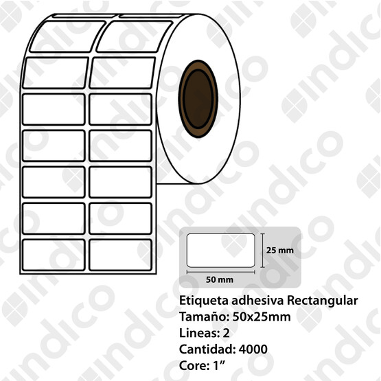 ETIQUETA ADH. RECTANG. TT 50MMX25MM X 2 LINEAS ROLLO X 4.000 CORE DE 1" TRANSFERENCIA TÉRMICA