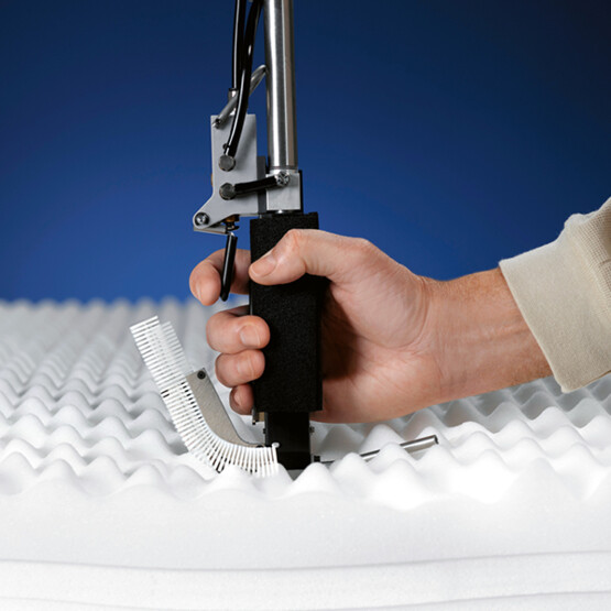 El sistema de sujeción de colchones de Avery Dennison elimina los adhesivos al agua, los pegamentos termo-contraíbles y los sucios rociadores. Solo inserte la aguja larga de uso extra pesado a través de múltiplex capas de espuma